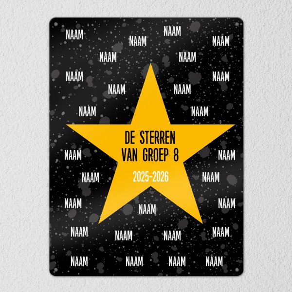 Daarnaast kun je dit metalen bordje volledig personaliseren. Zo kun je eenvoudig de namen van leerlingen aanpassen, of juist een persoonlijke boodschap in de ster plaatsen. Ook kun je kiezen voor een leuke tekst, zoals een afscheidsgroet, jaartal of klasnaam, zodat het bordje echt uniek wordt voor iedere leerling.